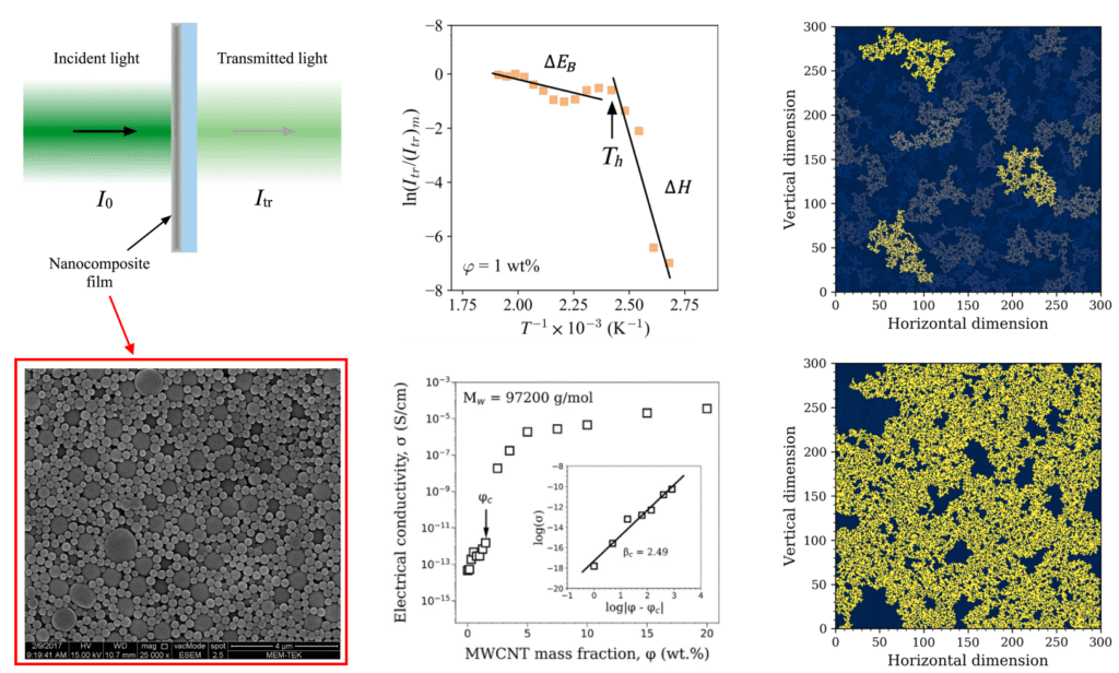Our research also extends into the soft matter domain, where we investigate the formation and structural evolution of polymer composite films. We study how nanoparticles or functional fillers are dispersed within polymer matrices and how these materials undergo film formation processes such as void closure and interdiffusion. Another particular focus is placed on understanding percolation behavior, which describes how conductive or mechanical pathways form within the composite as filler concentration increases. These studies help reveal how microscopic connectivity translates into macroscopic properties like electrical conductivity, mechanical strength, or optical transmittance performance. By combining experimental measurements with modeling approaches, we aim to design advanced polymer-based materials with tunable functionalities for applications in sensing, electronics, and coatings.